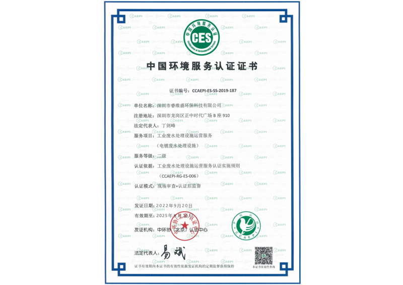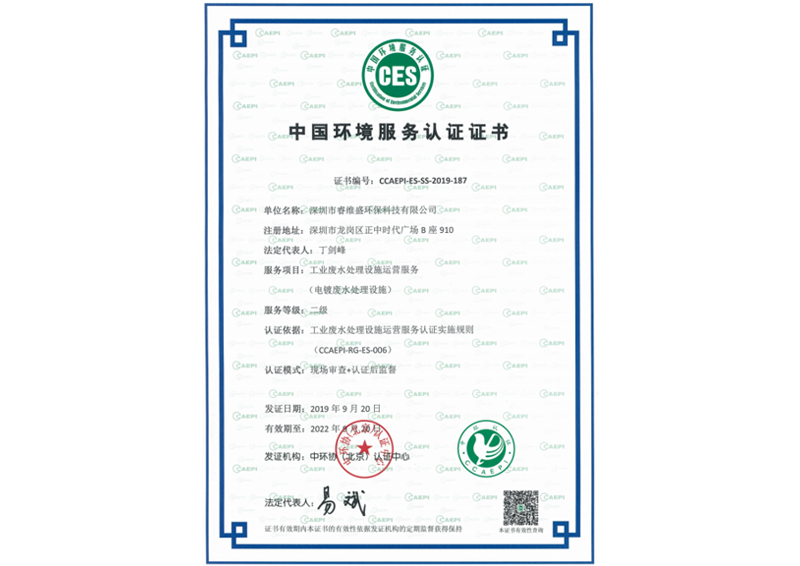• 中国环境服务认证证书